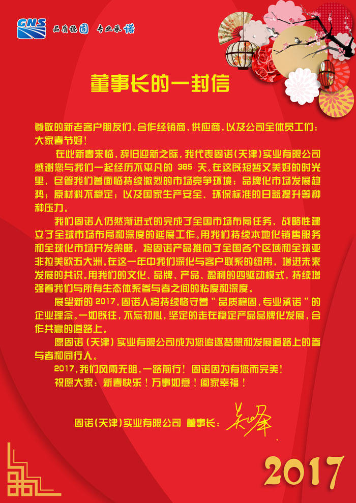 春節(jié)來到,固諾(天津)實(shí)業(yè)有限公司祝大家:春節(jié)快樂,萬事如意,身體健康,闔家歡樂!